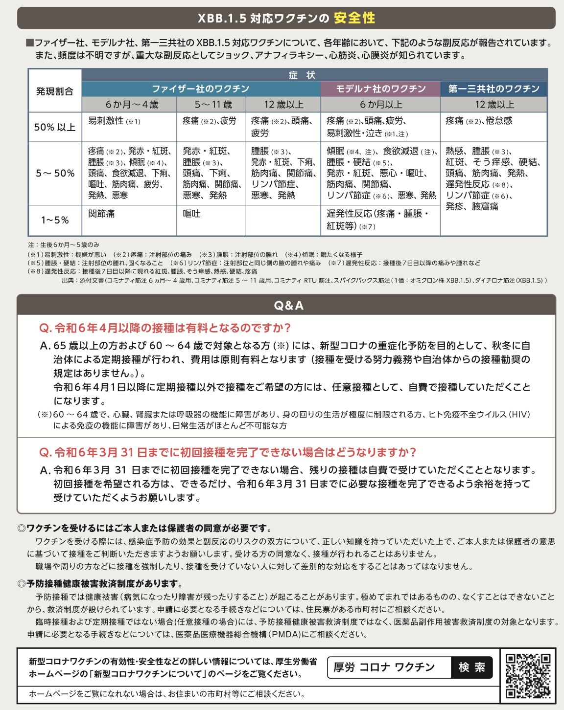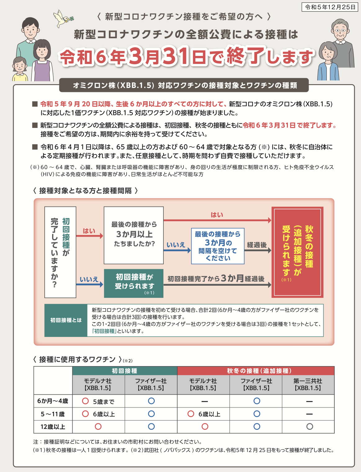 新型コロナワクチンの全額公費による接種は、初回接種、秋冬の接種ともに令和6年3月31日で終了します。接種をご希望の方は、期間内に余裕を持って受けてください。令和6年4月1日以降は、65歳以上の方および60〜64歳で対象となる方には、秋冬に自治体による定期接種が行われます。また、任意接種として、時期を問わず自費で接種していただけます。