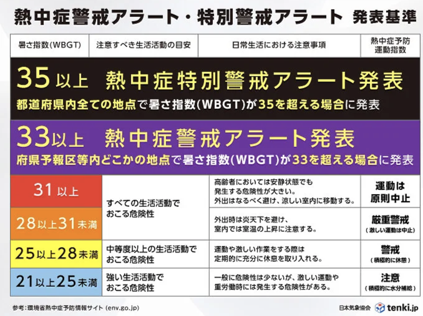 国内で過去に例のない危険な暑さが予想された場合に、熱中症を予防する行動の徹底を求める熱中症警戒アラートへ、「熱中症特別警戒アラート」が新たに導入されます。これまでの警戒アラートよりもさらに強く熱中症を予防する行動の徹底を呼びかけるものです。気温・湿度・輻射熱から算出される暑さ指数が県内すべての観測点で35以上と予想される場合に発表されます。