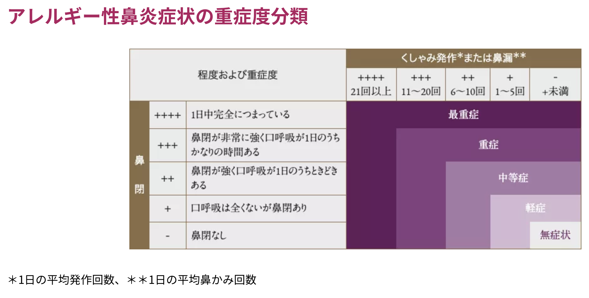重症度は、「軽症」「中等症」「重症」「最重症」に分けられ、「1日に起こるくしゃみ発作の平均回数」「1日に鼻をかむ平均回数」「鼻づまりの程度」によって判定されています。